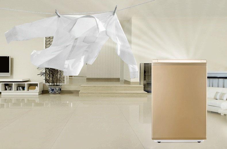 可移动式除湿机——可移动式除湿机的工作原理被处理的空气经风扇吸入后,先经空气过滤网过滤,然后在冷却的蒸发器上降温除湿,将空气中多余水蒸汽冷凝为水,使空气含湿量减少,由于除湿的冷凝水带走了一部分湿热,使空气的温度随之降低,为了使空气温湿度适宜,除湿机特有的结构使除湿后的空气再经过冷凝